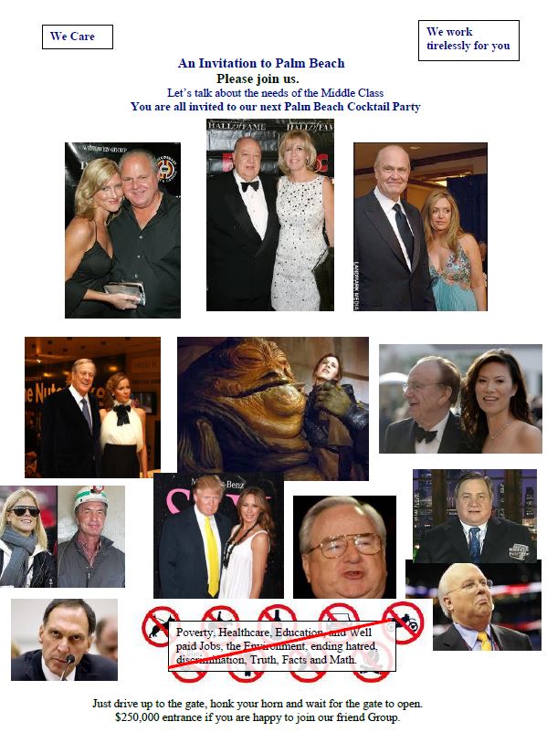 Imagine being at a cocktail party in Palm Beach: Are these individuals giving any thought to income discrepancy, Global Warming, the minimum wage, the lives of the very people whom they con into believing that they actually give a damn about them—the Disciples? Yes, they fund the Tea Party, and Fox promotes the Tea Party. But they would not be seen dead rubbing shoulders with the Tea Party protestors they created: their expendable infantry in their battle to secure total domination of the process.