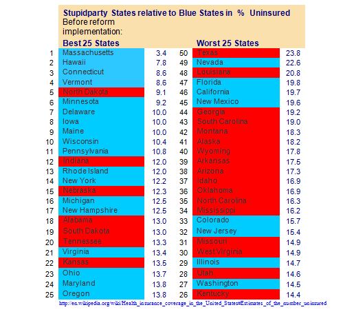 Stupidparty states relative to Blue States in % uninsured.