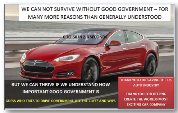 So next time Stupidparty moans about non scandals such as Solyndra (a government investment that did not lead to profit), you might just want to ask why they do not appreciate the many ways the taxpayers have profited from government investments or actions, including not having been invaded by Germany or Japan in 1940—a time when the USA was extremely vulnerable—or Russia since 1940. Or on the other hand, ask them about Tesla—a car company built on the back of government assistance—because the government can be a lot smarter than Stupidparty Disciples, in that it clearly has a better understanding of the importance of the technologies behind Tesla (zero gas) or Solyndra, for that matter (solar panels). As we speak Tesla now has a sports car sedan that can do 0-60 in 2.8 seconds – an SUV like vehicle that will be able to do 0-60 in 3.2 seconds. The cars look beautiful, and the Model S was voted best car of the year for two yeas in a row by Consumer Reports and Time and Best Car of the Year by Motor Trend.
