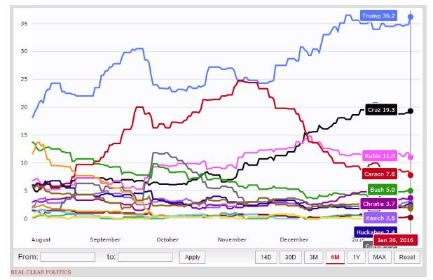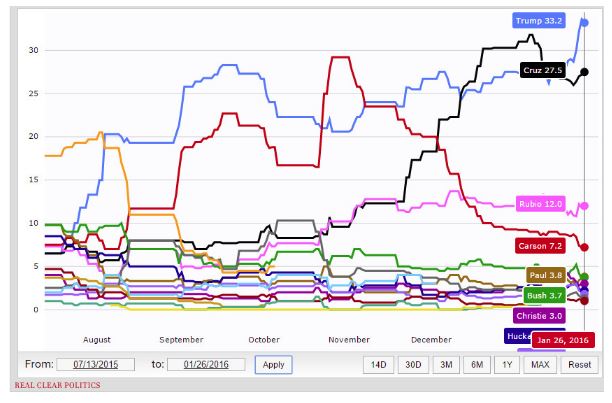 Yes, all the stars are more-or-less aligning in Trump’s favor, and just in time for him to win the first contest for his party’s presidential nomination, in Iowa on Monday, February 1st. Expect with a high degree of confidence for Trump to win by a slim to medium margin. And, with the weird nature of caucuses, which are not a blind voting system but actually a series of conversations between supporters, some of Cruz’s supporters may bolt to Trump if they are feeling like flocking to a winner, meaning Trump has a decent chance to even exceed the margin polls b which will be predicting him to win.