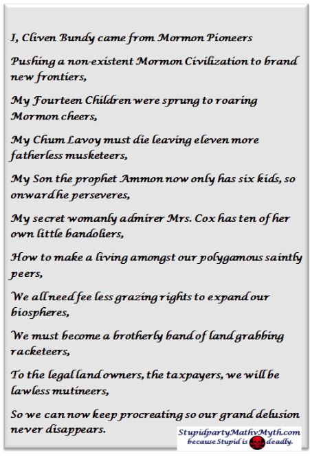 We need to find where the inspiration for the Malheur National Wildlife Refuge occupation came from and who these Stupidparty heroes really are. Who are these freedom loving patriots, the constitutional scholars, and what is their beef? Do they have a case? In this particular instance we need to start by learning just a bit about one man and his family. To set the scene let me utilize a poem that Cliven Bundy is rumored to have written: