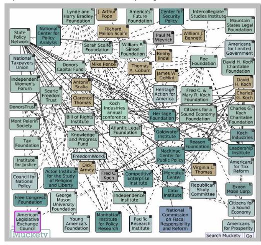 “The New York Times reported that special interests have ‘effectively turn[ed] ALEC’s lawmaker members into stealth lobbyists, providing them with talking points, signaling how they should vote and collaborating on bills affecting hundreds of issues’…Bloomberg Businessweek stated, ‘Part of ALEC’s mission is to present industry-backed legislation as grass-roots work.’ The Guardian described ALEC as ‘a dating agency for Republican state legislators and big corporations, bringing them together to frame right wing legislative agendas in the form of “model bills.”’ Several liberal groups, including Common Cause, have challenged its tax-exempt status.”
