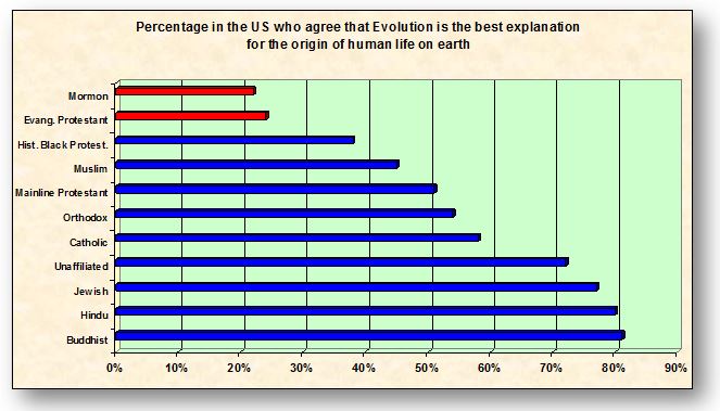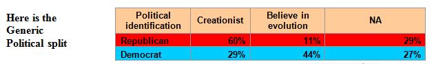 Before drilling down on numbers, I often like to take international statistics, in order to create a benchmark to analyse how various U.S. states hold up against both international and domestic comparisons. In this particular subject, I could not find a breakdown by U.S. state. But we do know that only about 22% of Mississipians and 26% of Alabama “folk” believe in evolution, and those numbers would no doubt shrink even further if one stripped out the lonely Democratic voters in those states.
