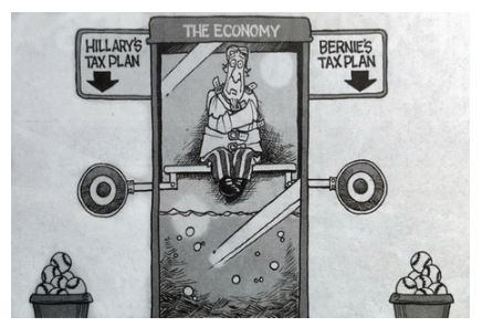 Bernie is the only candidate who honesty endorses the taxing of extreme wealth, so that the economy may reinstate the America Dream of a growing middle class. A fact that needs to be accomplished for the middle class, of which Hillary’s plan does not fully address. But this right-wing cartoon takes them both down.