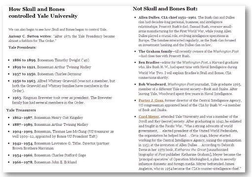 (* including the Washington Post and Bob Woodward) *Though Bob Woodward was not in the Skull and Bones, he was in a lower-level group called the Book and Snake. After leaving Yale, Woodward spent five years in the navy. He had top-secret clearance while serving on the USS Wright, where he specialized in communication, including with the White House. Woodward has denied any intelligence connections, but there are audio tapes of various members of the top military brass speaking of his “White House service.”