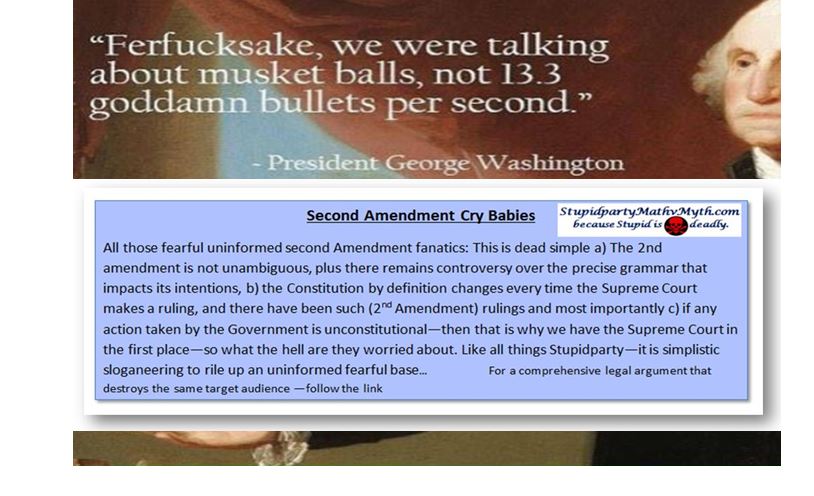 Second amendment sloganeering and bumper stickers. This is dead simple a) The 2nd amendment is not unambiguous, plus there remains controversy over the precise grammar that impacts its intentions, b) the Constitution by definition changes every time the Supreme Court makes a ruling, and there have been such rulings and most importantly c) if any action taken by the Government is unconstitutional—then that is why we have the Supreme Court in the first place—so what the hell are they worried about. Like all things Stupidparty—it is simplistic sloganeering to rile up an uninformed fearful base.