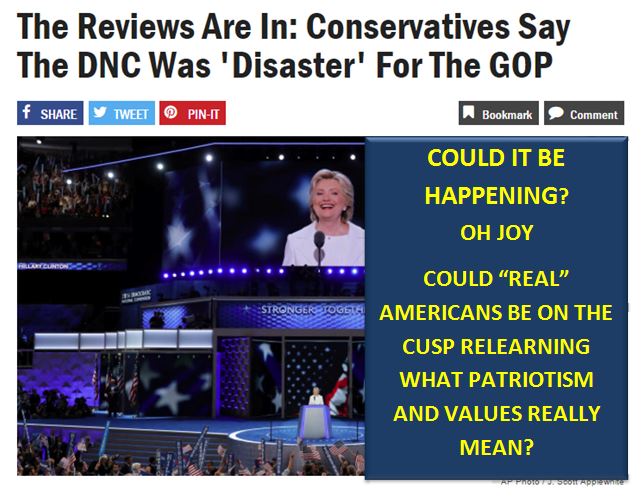 Congratulations to Hillary and her convention planners for allowing the conditions to materialize for the GOP to finally die and be reborn into a legitimate opposition. And thank you, Trump, for giving Trumpeteers no place to hide. For without Trump, America’s habit of pushing hate and ignorance under the carpet could have carried on all the way to a fascist state.