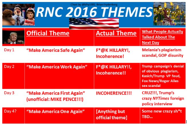 So, rather than have a night focused on a positive message about jobs and the economy, and rather than have that be the discussion as the third day of the convention began, instead, there was no discernible message on the economy, and talk was dominated by anew scandal of the campaign and its senior staff lying/denying when it came to the plagiarism issue. If this wasn’t bad enough, a new New York Times Magazine report that Kasich was offered the Vice President slot by one of Trump’s sons—apparently even offered the power to run both domestic and foreign policy (denied by the Trump team)—escalated an already existing feud between Trump and Kasich (Kasich was called a “sore loser” at one point).