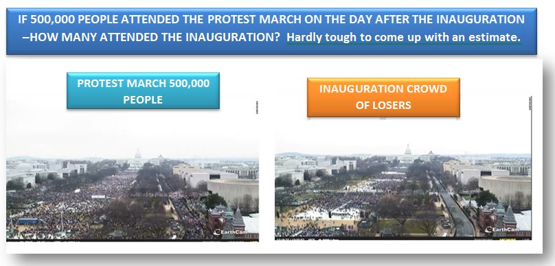 So how many did show up for the Trump inauguration? Bare in mind, by all accounts in 2008 Obama had 1.8 million people. The park service today does not give out estimates, for legal reasons -but that should not prevent a common senses estimate. Before the inauguration the estimate was for 900,000 people but it is clear that the actual numbers did not come close to that. So how should we come up with a number. Well the next day there was a protest march with an estimated 500,000 people. Extrapolating from subway rides, bus permits and a simple visual it (below) it would seem Trump drew somewhere between 250,000 – 350,000 people.