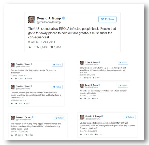 Make America Great again… I will be the greatest jobs President…I will build a wall… Ban Muslims from entry… I will torture more. I will blow up families of terrorists. “Crooked Hillary”.