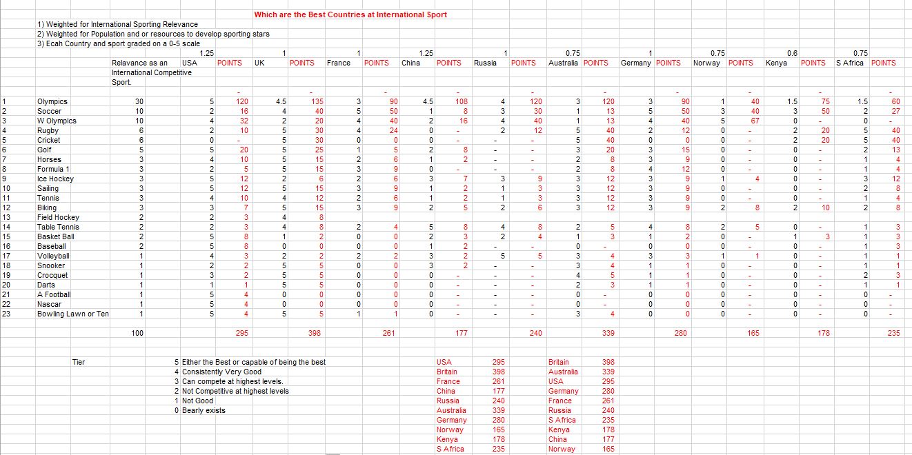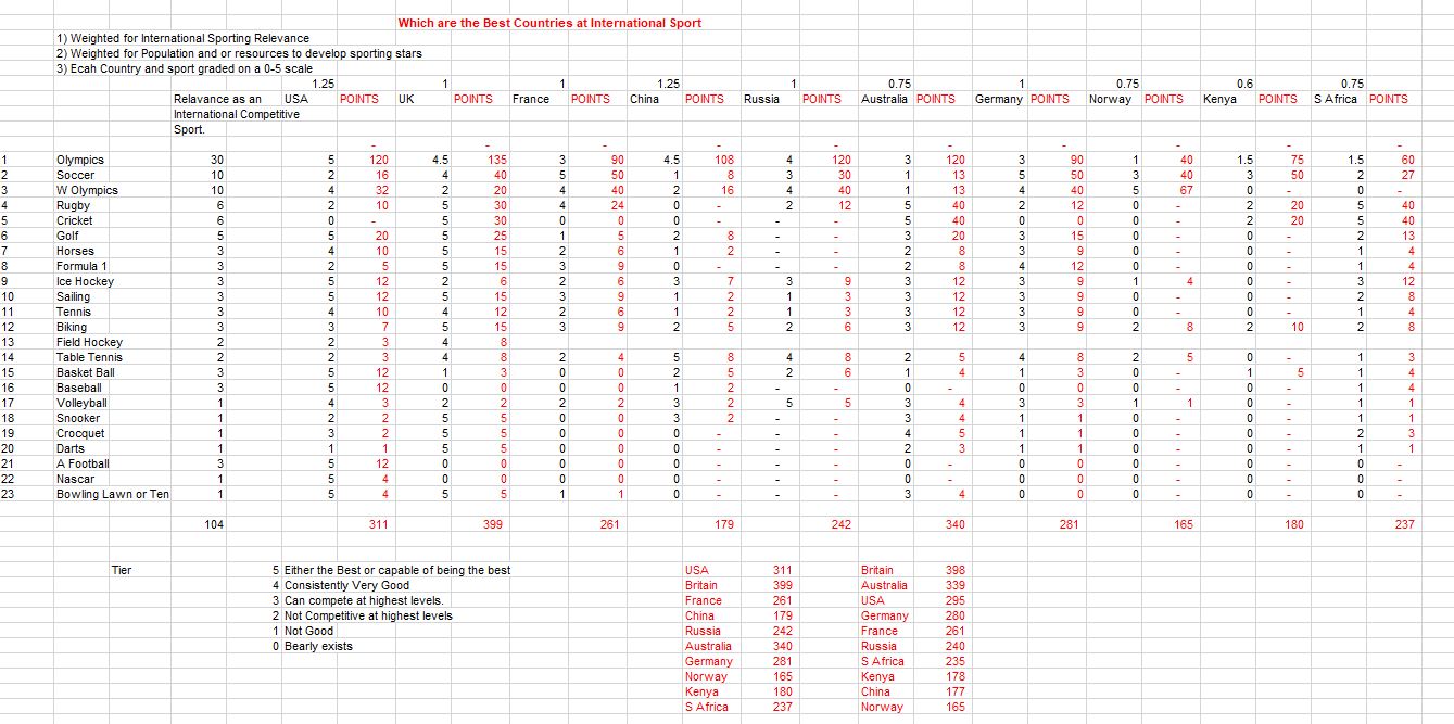 Below I rectify that slightly unfair weighting. I also give baseball and basketball a quite generous weighing of 3. None of this changes America’s position, at #3. Britain wins—and this is a result I had never really considered; it was actually not that important to me (I have a growing dislike of jingoism—especially in this era of rising nationalism). Britain #1? This is certainly not known amongst the Brits. I had always considered Australia the best sporting nation in the world—but they have gone downhill; one of the reasons being their fetish for Australian rules football, but at least this sport does not have a world series as their capper.
