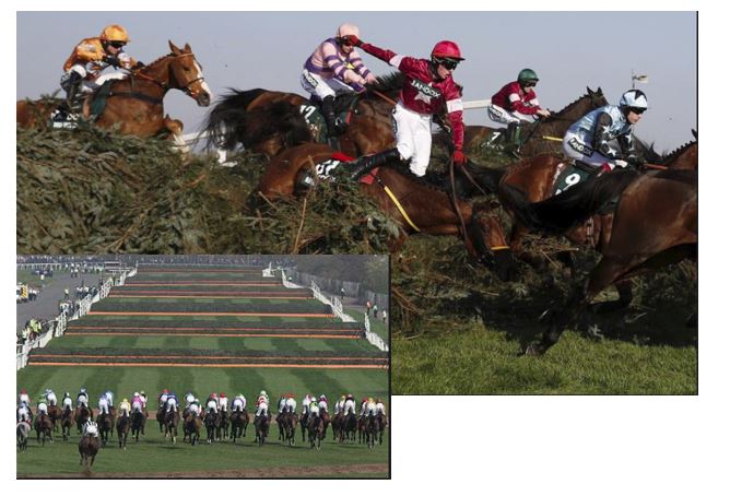Grand National at almost 4.5 miles long, 30 fences. Kentucky Derby by comparison is 1.25 miles.