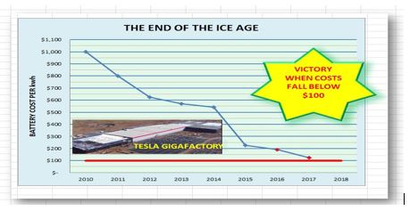 - People have been saying that if this cost were to fall to about $100 per kWh that would signal the end of the fossil engine.