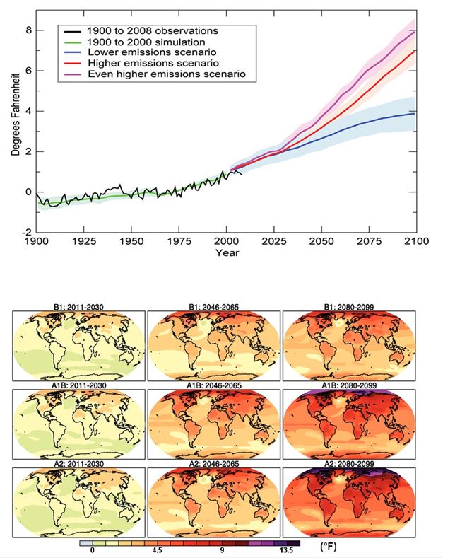 Projected changes in global average temperatures under three emissions scenarios (rows) for three different time periods (columns). Changes in temperatures are relative to 1961-1990 averages. The scenarios come from the IPCC Special Report on Emissions Scenarios: B1 is a low emissions scenario, A1B is a medium-high emissions scenario, and A2 is a high emissions scenario. Source: NRC (2010)