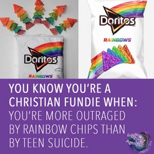 Guest post by Matthew 7:1 from the Imaginary Gay Agenda:"I've often been curious why the outrage of Christian fundamentalists seems to revolve around foodstuffs. From rainbow wrappers on Whoppers, to places that sell pickle-stained chicken sandwiches and support the crusades of hate in Africa, to … [Read more...]